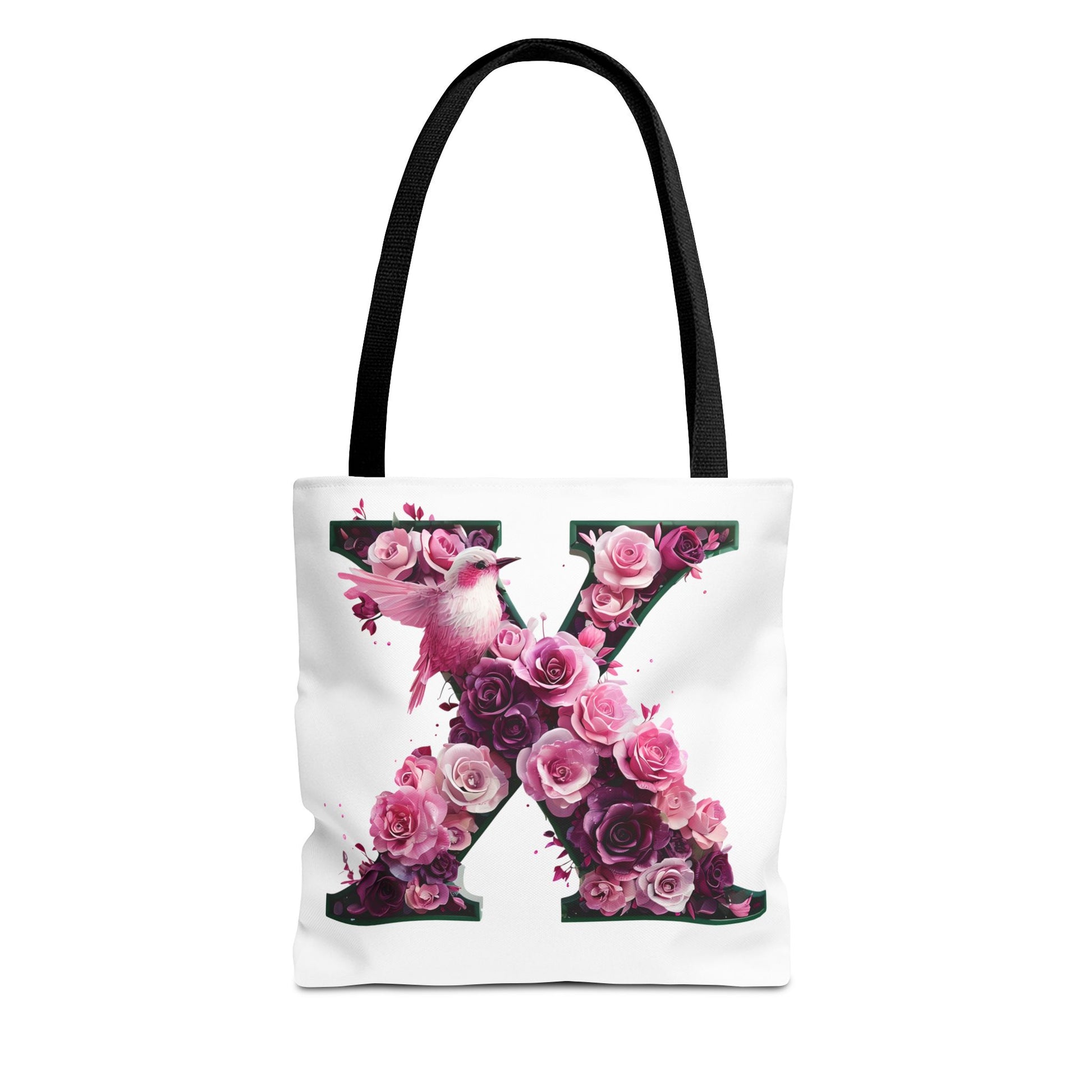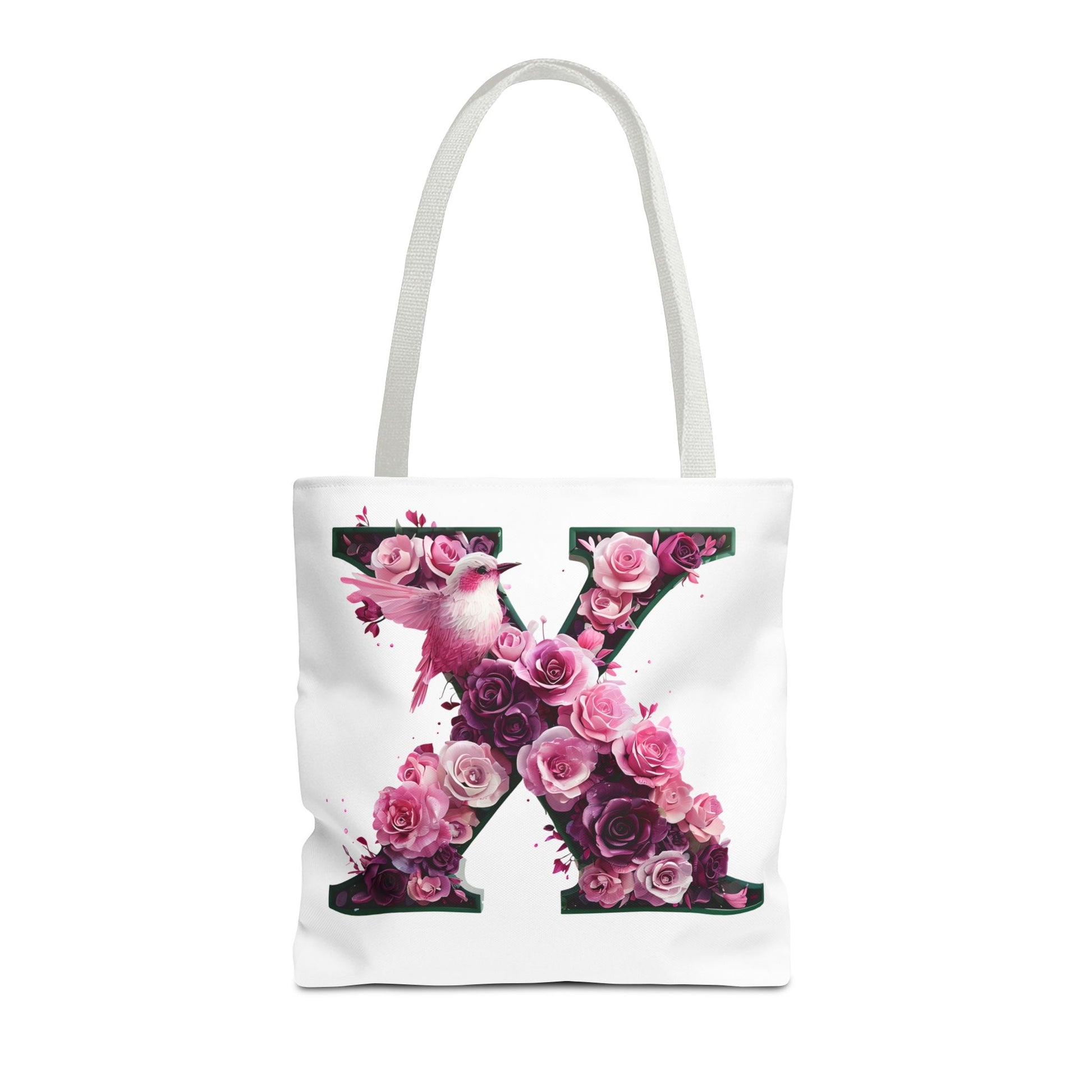 Floral Alphabet 'X' Tote Bag with Pink and Purple Flower and Bird Design